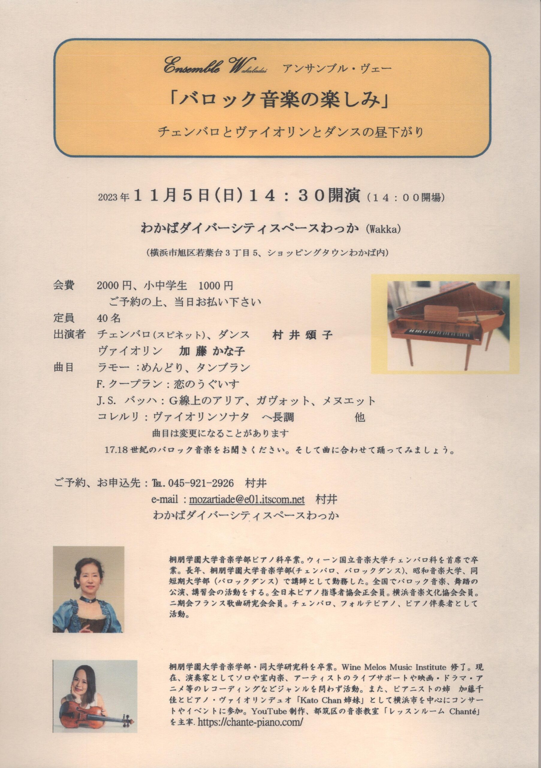 2023年10月10日 / 最終更新日時 : 2023年10月19日 marukodesign コンサート 「バロック音楽の楽しみ」チェンバロとヴァイオリンとダンスの昼下がり 日付 2023/11/05 時間 14:30開演/14:00開場 場所 わかばダイバーシティスペースわっか(Wakka)