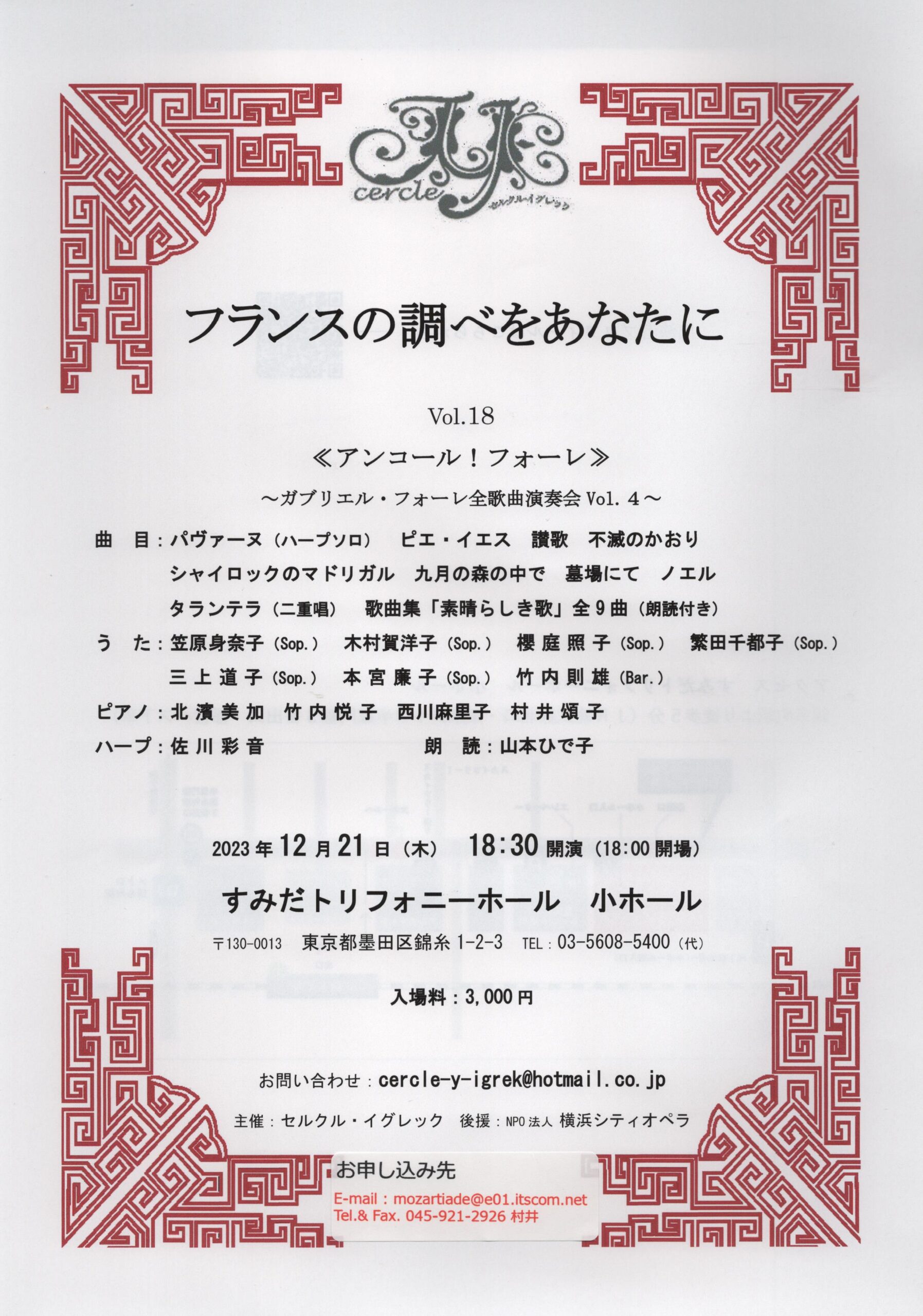 2023年10月11日 / 最終更新日時 : 2024年2月24日 頌子村井 コンサート フランスの調べをあなたに 日付 2023/12/21 時間 18:30開演/18:00開場 場所 すみだトリフォニーホール 小ホール
